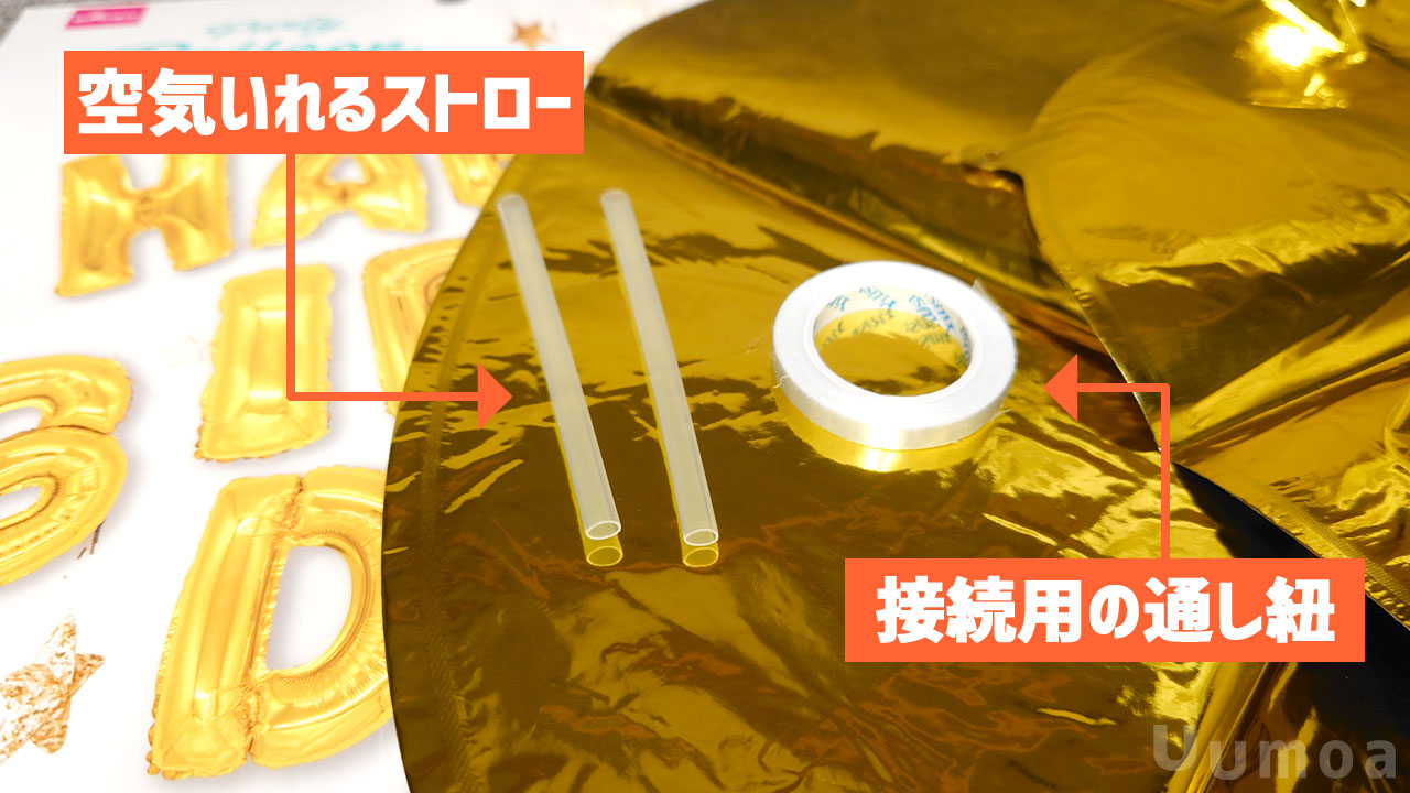 いよいよバルーンの準備!付属品に空気をいれるためのストローと膨らませたバルーンを繋ぐための紐が付属していたよ。