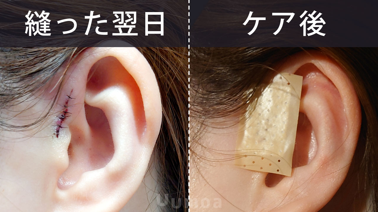 シャンプーのときに絆創膏を外して入ったが、出血などのトラブルも無く大丈夫だった。慣れない手つきで消毒し、軟膏を塗って絆創膏を貼る。洗面台が3面鏡で良かったと思いながら私は毎日何度も左耳を見た。